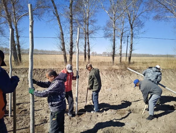 在潜字村牧业小区植树现场,放眼望去,一片热火朝天的劳动景象。大家三五成群,分工协作,挥锹铲土、扶苗培土,每一个环节都认真细致、一丝不苟。一棵棵新栽的银中杨迎风而立,在春光中焕发出勃勃生机。